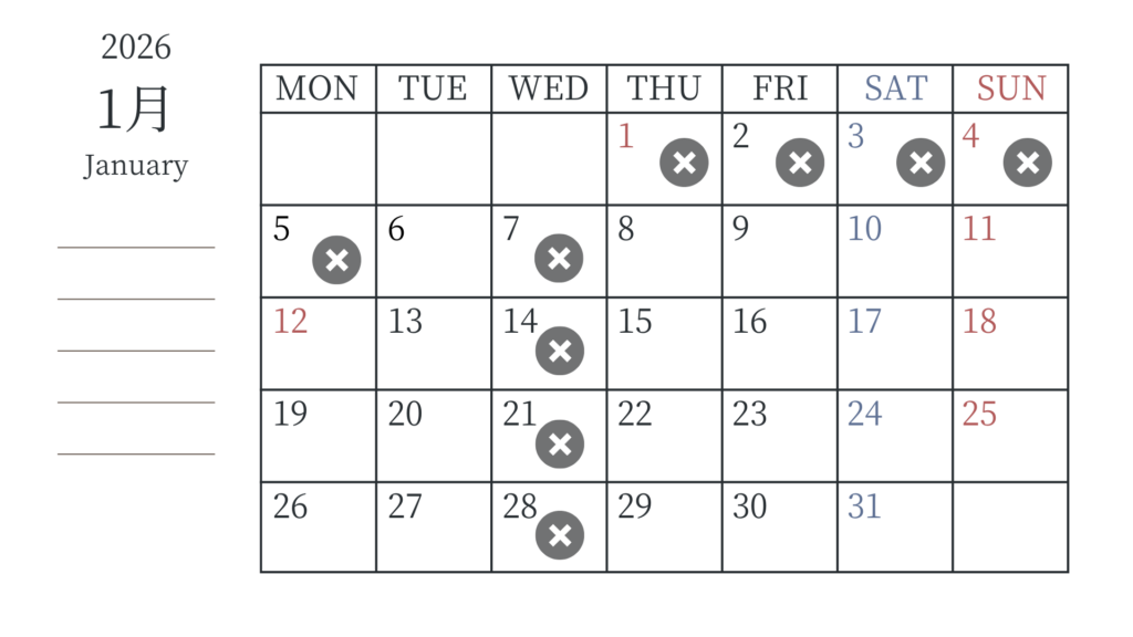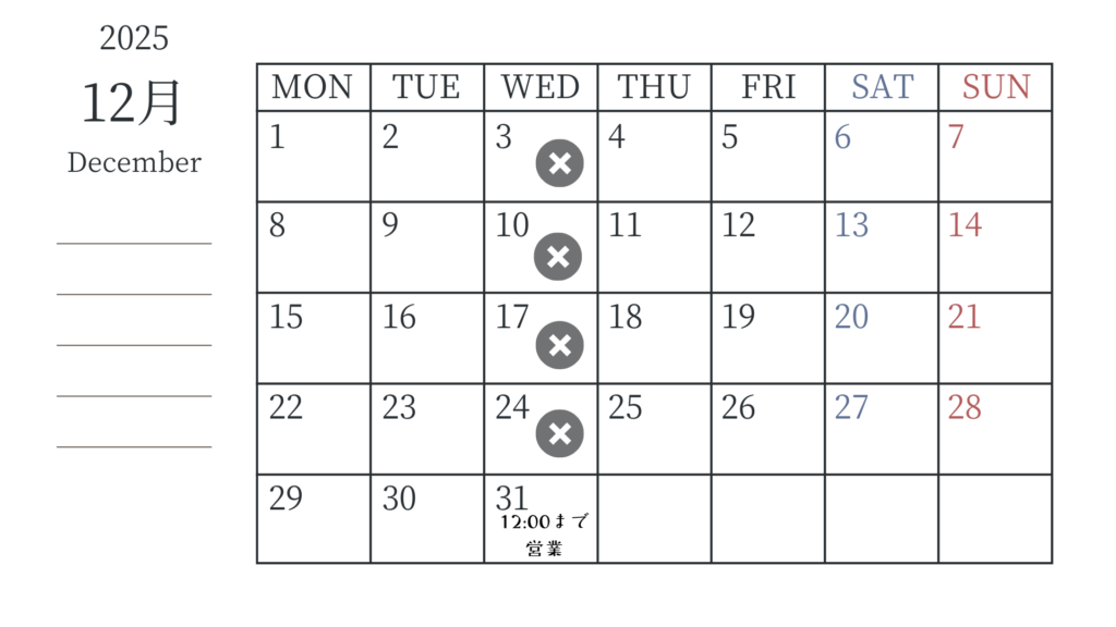 2025年の最終営業日は、12月31日(水)昼12:00まで営業いたします。午前中までの営業となりますのでご注意ください。