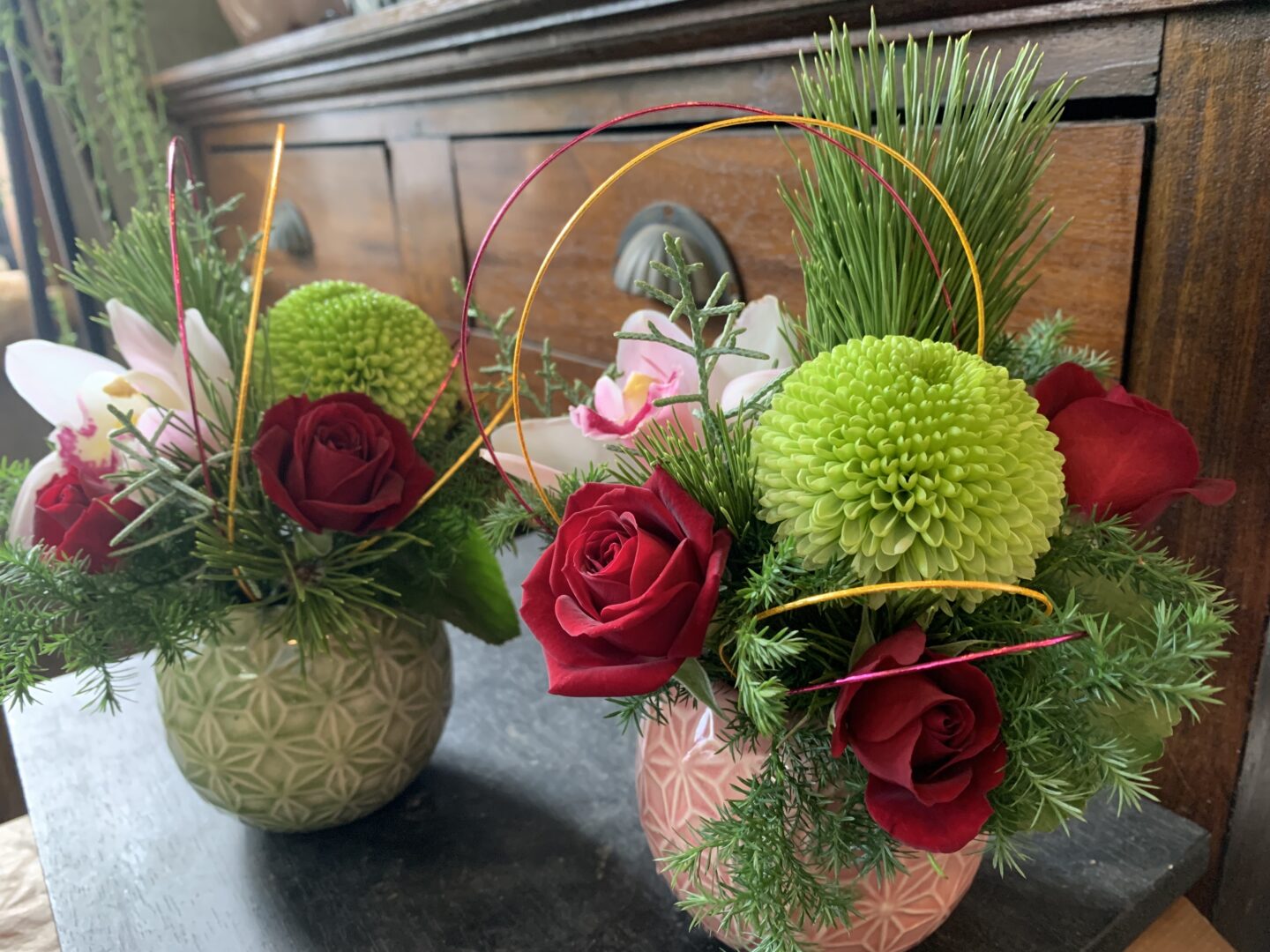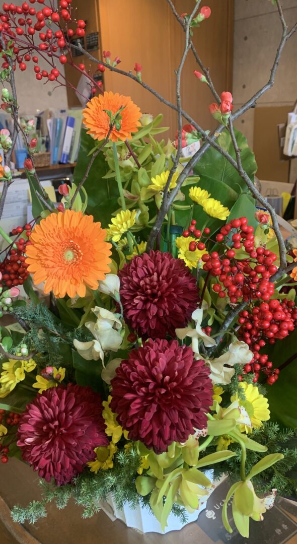 このたびはフラワーアレンジメントのご依頼、誠にありがとうございます。今回制作したのは、お正月用のフラワーアレンジメントでした。普段お花を飾らない方でも、お正月・新年だけは特別に飾ったりして、めでたい雰囲気を楽しみます。